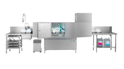 Tipo túnel diseñado para garantizar el máximo ahorro de energía. Equipado con sistemas tecnológicamente innovadores, que utilizan la cantidad de agua necesaria para enjuagar y lavar circulando a alta temperatura. altamente productiva con una capacidad de 1800 piezas por hora aproximadamente. según el modelo.